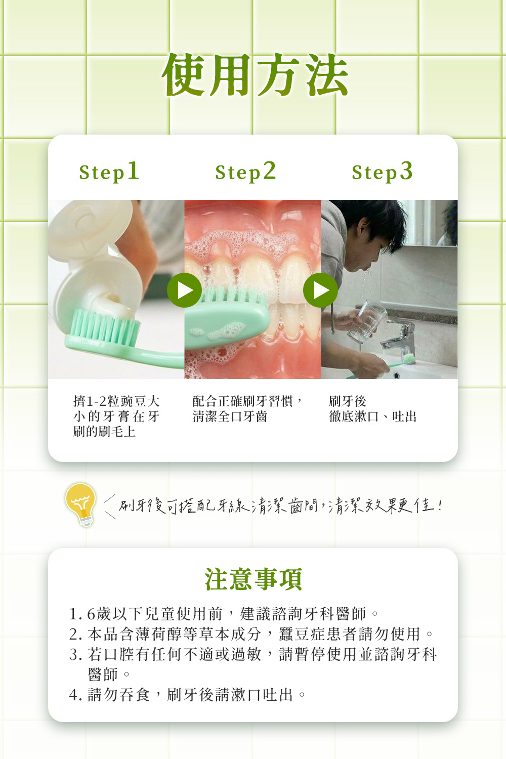 3. 若口腔有任何不適或過敏,請暫停使用並諮詢牙科醫師。